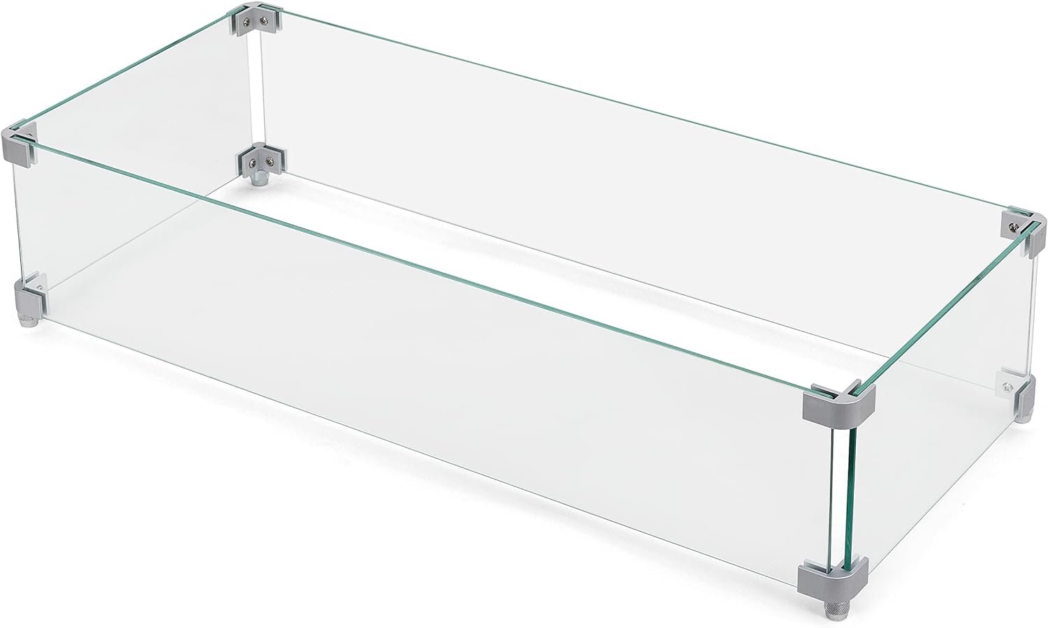 About this item PERFECT FIT FOR FIRE PIT: The glass wind guard measures 28 x 12 x 7 inches and is a must-have piece of equipment for any fire pit smaller than it in any patio or garden. And a clearance between the fire pit table and the wind guard can create smooth airflow and improve work performance DURABLE MATERIALS: The fire pit windscreen is made of strong, heavy-duty tempered glass with polished edges, so it lasts as long as your fire pit does. Wind boards are thickened, providing stability and security. In contrast to ordinary glass, our premium material extends the service life STURDY CONSTRUCTION: Sturdy aluminum brackets offer firm connection and steady support. The heat-resistant aluminum feet keep the wind guard in place on the fire table. And the non-slip pads increase the stability of the base. Satin finish brackets are of thoughtful round corner design and offer reliable protection for children, families, and guests GUARD FLAMES: Rectangular tempered glass wind guard helps to prevent the flame from blowing around excessively, potentially causing damage. It also allows the fire to burn consistently at a lower flame height, while unguarded flames will be burned at higher altitudes and consume more fuel APPEALING EFFECT: With a minimalist design and clean edges, the glass flame guard complements your outdoor fire pit and instantly gives it a more modern, sophisticated appearance. Dancing flames elegantly reflect on the clear glass and shine with a flickering effect