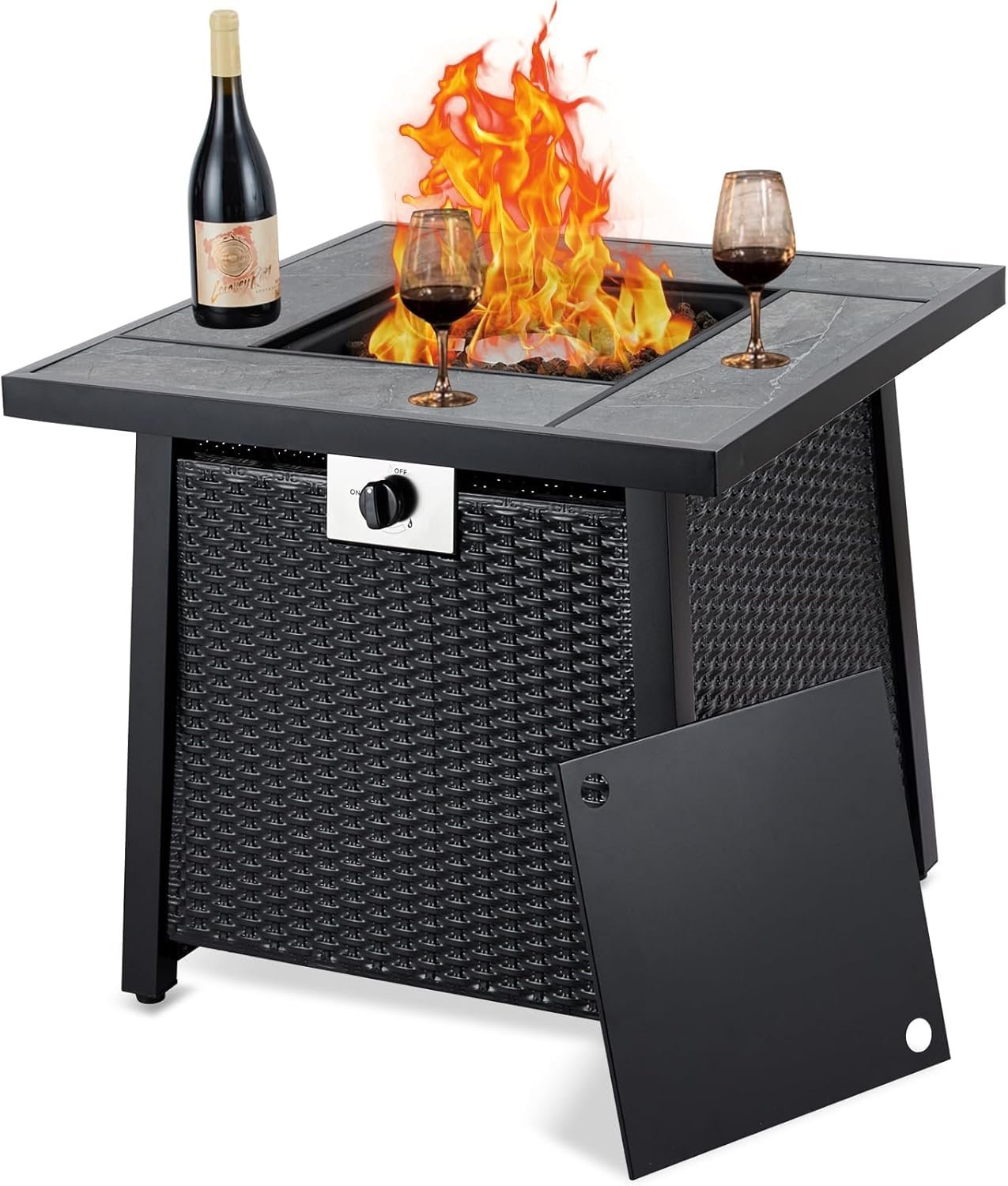 About this item ð¥Powerful Heat Output: Experience the warmth of this 28-inch outdoor gas fire pit with a powerful 50,000 BTU output. Enjoy cozy evenings with adjustable radiant heat, perfect for gatherings in your patio or garden ð¥Smokeless Control: The chrome manual control valve allows for 100% smokeless variable flame height. Just press the pulse switch and rotate the valve knob, and the electronic ignition system will swiftly ignite a stunning fire ð¥Reliable Construction: Crafted with a robust steel surface and coated with high-temperature paint, this fire pit table is designed to withstand the elements while maintaining its sleek, black finish for years of enjoyment ð¥Versatile Dining Functionality: Easily cover the fire pit to create additional space for family and friends to enjoy light meals together. This multifunctional feature enhances your outdoor experience for every occasion ð¥What You Got: Product size: L28âx W28âx H24.5. This patio firepit table comes with a lid and lava rocks, providing both versatility and visual charm. Our commitment is to the gas outdoor fire pit with a 24-month warranty and professional and friendly after-sales service